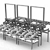 A six-channel Inoca system is designed to vaccinate between 15,000 and 21,600 fish per hour, and requires three operators, each of whom feeds fish into two channels.