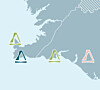 Matorka's locations on the Grindavik peninsula. The farm is marked by the blue symbol, the hatchery by the pink symbol, and the airport and port by the green symbols.