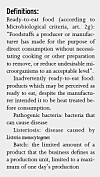 Guidelines and criteria for Listeria The rules for monitoring and control of Listeria in ready-to-eat products have become stricter. This is because there has been an increase in Listeria cases in Europe over the past decade, and that there are constantly new “ready-to-eat” and “ready-to-heat” products on the market. The current legislation for Listeria in ready-to-eat food is the Microbiological Criteria No. 2073/2005 of the EU. In the regulations, the authorities lay down the overriding criteria, and it is up to the food companies to “translate” these into the best practices for their own production. It is also up to the manufacturer to decide if the product shall be considered ready to eat food or not.